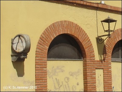 Das Skelett der Bahnhofsuhr ist noch vorhanden, die Inschrift wurde wohl einmal erneuert.