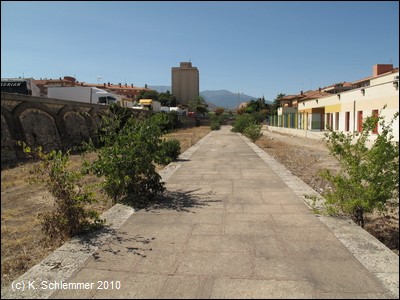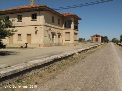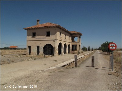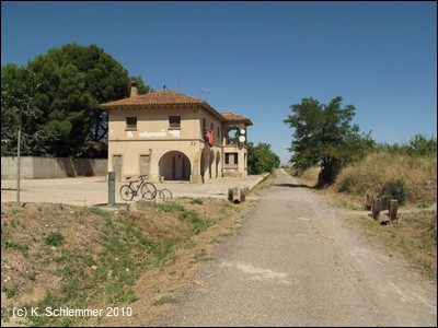 Die Fahrbahn ist halbseitig asphaltiert und mit Splitt bedeckt. Wir erreichen den verlassenen Bahnhof von Murchante, der wieder etwas außerhalb des Ortes liegt.