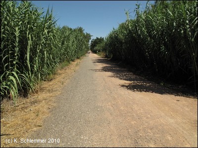 Die Benutzungsanleitung für die Vía Verde erinnert eher an deutsche Bürokratie: immerhin, Höchstgeschwindigkeit 20 kmh und nicht 10 kmh wie sonst üblich! Durch einen Schilfgürtel geht es stadtauswärts.