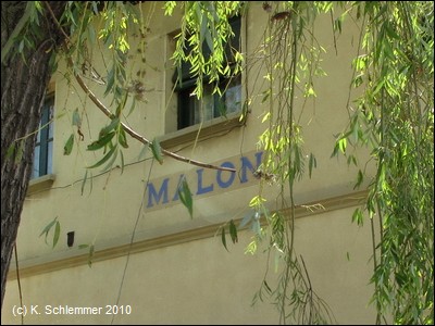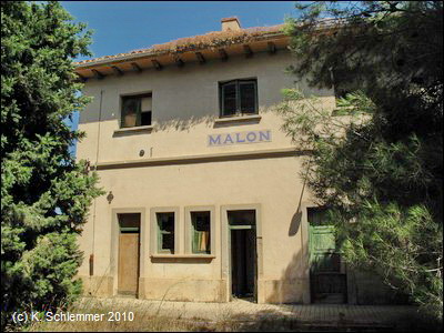 Einfahrt ins Bahnhofsgelände von Malón. Das Bahnhofsgebäude ist eine Ruine.