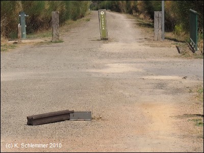 Die Markierung ist auch an den Pfostensperren angebracht. Alte Brücken überqueren die Trasse in den Einschnitten.
