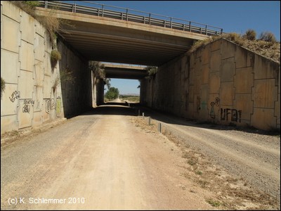 Dann geht es unter der Autobahn AP-68 hindurch. Noch 5 Kilometer bis zum Bahnhof Tudela.