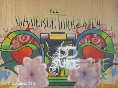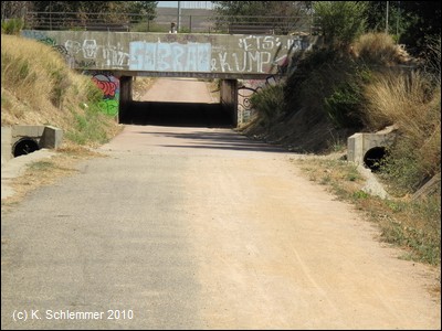 Wir sind nun an der aktuellen Bahnstrecke angekommen, der Weg macht eine Kurve Richtung Norden. Das Graffiti an einer Brücke erinnert an die Vía Verde.