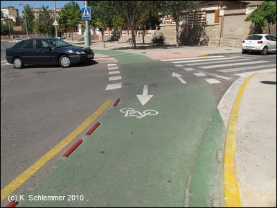Dann endet der Radweg auf der Trasse, die Strecke ist durch Straßen überbaut. Ein grüner Streifen auf der Straße führt uns weiter Richtung Innenstadt.