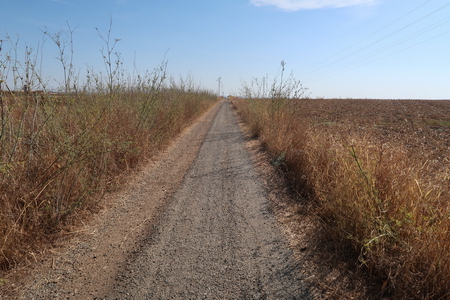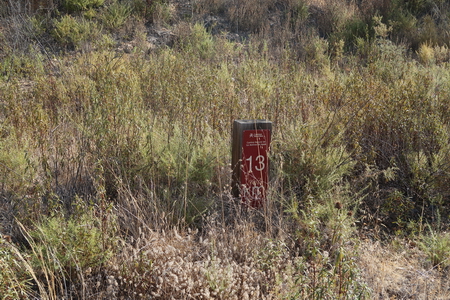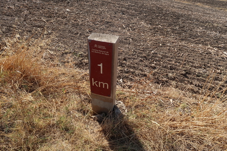 Wir lassen uns nicht abschrecken! Die Strecke führt durch Getreidefelder Richtung Bergland. Am Wegrand findet man Reste der Kilometrierung, oft nicht mehr lesbar.