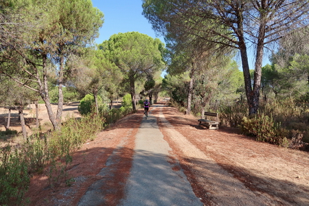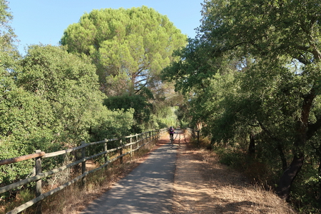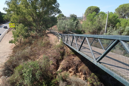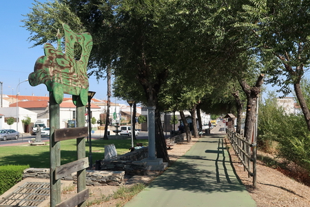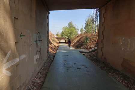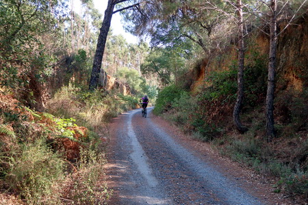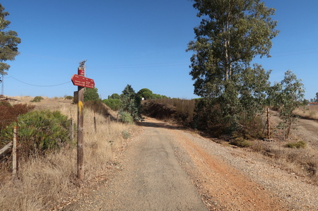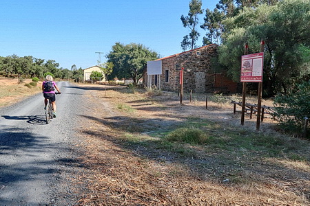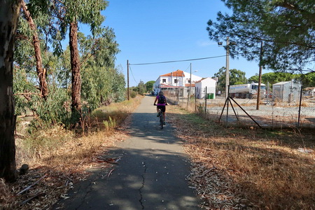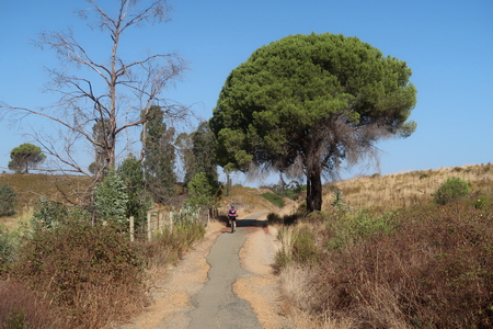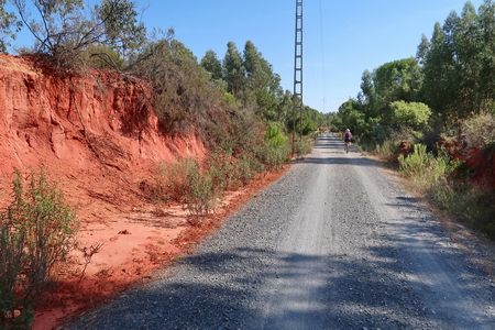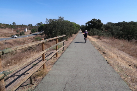 Der Radweg steigt nun etwas an und durchquert ein Waldgebiet mit Pinien und Eukalyptusbäumen. Auch Zistrosenbüsche, die ihren charkteristischen Duft verströmen, findet man reichlich am Rande des Weges. Bei Fuente de la Corcha (Kilometer 20) gibt es einen kleinen Rastplatz. An alten Korkeichen vorbei geht es weiter bergauf. Bei KIlometer 27 der ehemaligen Bahnstrecke (Venta del Cuervo) befand sich ein Bahnhof, dort überquert der Radweg die N-435 auf einem eisernen Steg. Nur noch 7 KIlometer auf der asphaltierten Trasse fährt man parallel zur Nationalstraße nach Valverde del Camino. Hier findet man Verpflegung und Übernachtungsmöglichkeit.