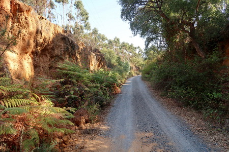 Es geht immer noch aufwärts - hier durch einen Einschnitt, gesäumt von Eukalyptusbäumen.