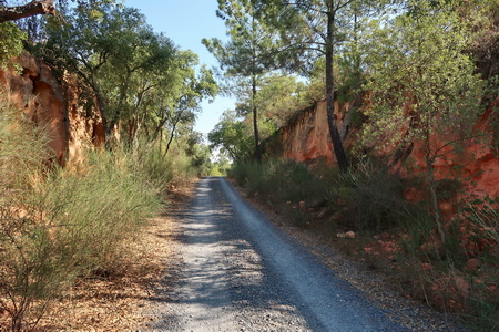 Alte Korkeichen in bizzarren Formen wachsen aus dem roten Lehmboden.