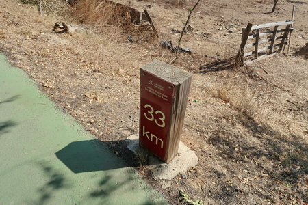 Hier ist die Kilometrierung noch in Ordnung. Die Trasse wurde zur Hälfte mit Asphalt befestigt, der Rest besteht aus fester Erde und Splitt.