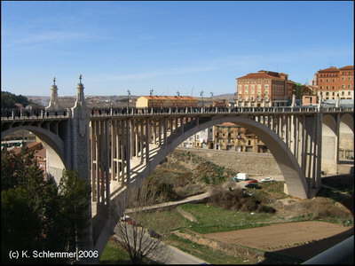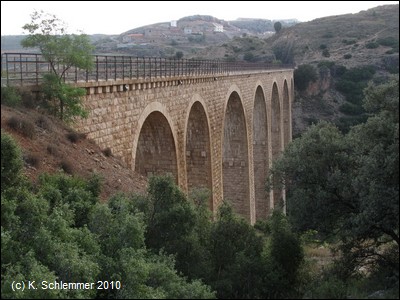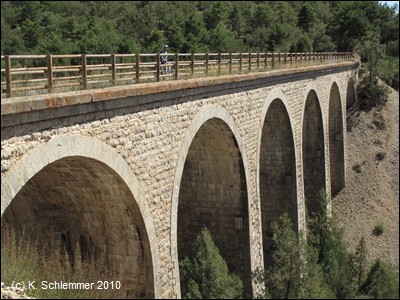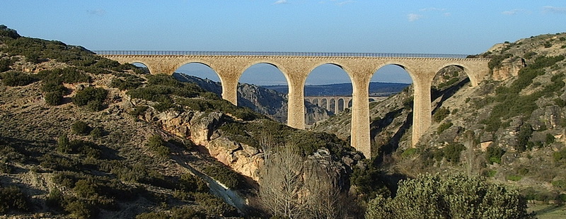 Das Viadukt von Albentosa, ein monumentales Bauwerk: 179,45 m lang, 50 m hoch. Im Hintergrund erkennt man das Viadukt der Parallelstrecke.