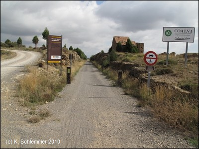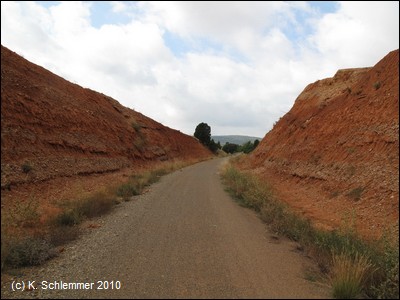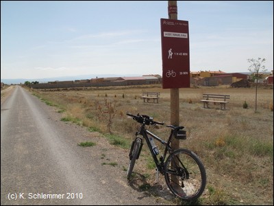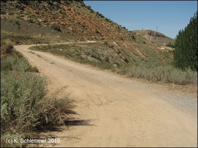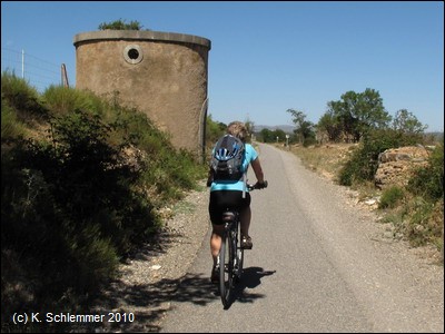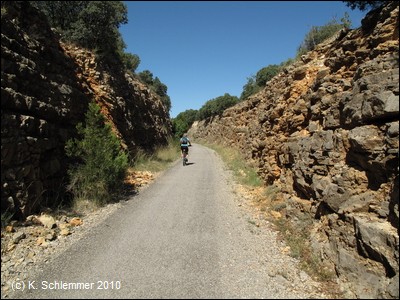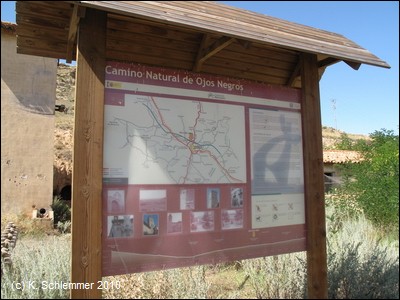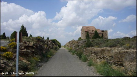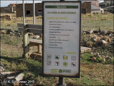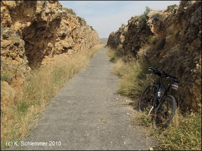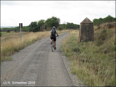 Rund 50 Kilometer trennen den Radler noch von den Eisenminen von Ojos Negros, rund 30 Kilometer sind auf der alten Bahntrasse noch ausgebaut. Das letzte Stück zum Beginn der Bahnstrecke muss man auf Nebenstraßen fahren, bis vielleicht irgendwann die Bahnstrecke noch ausgebaut wird. Nach der Hauptstadt Teruel führt die Trasse zuerst leicht bergauf, bei Cella erreicht man den Rio Jiloca, dem die Strecke weiter folgt. Es geht durch eine schier endlose weite Hochebene, die dem Radler einiges an Ausdauer auf diesem geraden und eintönigen Abschnitt abverlangt. Auch mit Widrigkeiten des Wetters muss gerechnet werden, es gibt in diesem Abschnitt kaum Unterschlupfmöglichkeiten. Heftiger Wind kann die Fahrtdauer erheblich verlängern! Die verlassenen Minen mit ihren verfallenden Gebäuden haben allerdings ihren eigenen Reiz. Die Gegend ist entvölkert, Projekte zur Verbesserung des Tourismus sind offensichlich in Planung. 2010 sahen wir die Schilder eines Unternehmens, das einige der alten Gebäude zu einer ländlichen Unterkunft ausbauen will. In diesem Jahr waren auch die Schienen bei Ojos Negros entfernt, die zuvor noch bis zu den alten Gebäuden führten. Vielleicht ist doch noch ein weiterer Radwegausbau geplant. Über der Hochebene bei Ojos Negros in Richtung Monreal del Campo steht noch eine alte Windmühle, die schön restauriert wurde und dafür sogar einen Preis erhielt. Von dort aus hat man einen herrlichen Blick über die Landschaft des Rio Jiloca. Ein weiterer markanter Punkt ist die Felsenburg Castillo de Peracense, wahrscheinlich aus dem 13. Jahrhundert.