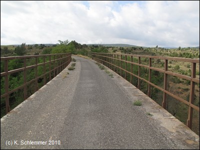 Und wieder ein Viadukt! Der Blick zurück zeigt eine rot-grüne Landschaft.