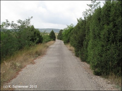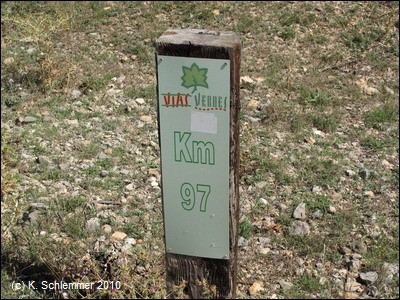 Wir fahren oberhalb der Ebene parallel zur Autobahn. In einer weiten Kurve geht es dann hinab ins Tal.