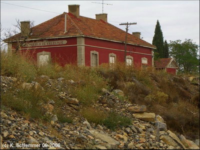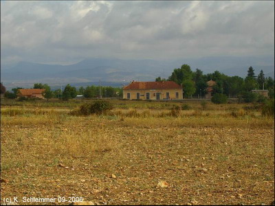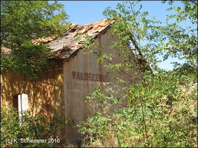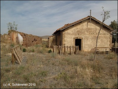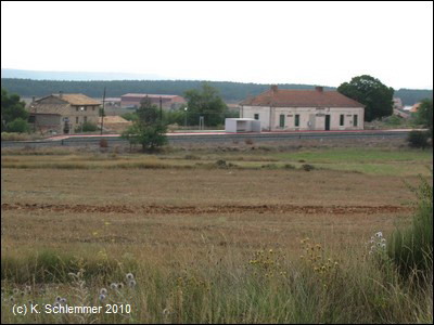 Der Bahnhof von Valdecebro taucht auf. Das Gebäude ist eine baufällige Ruine, Betreten verboten und gefährlich!