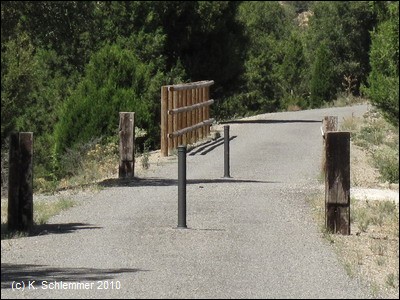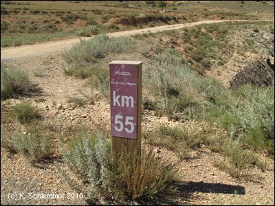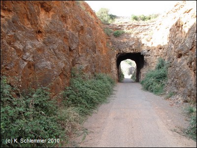 Auf der anderen Seite erreicht man wieder die alte Trasse. Hier beginnt der zuletzt ausgebaute Teil der Vía Verde. Noch sind wir 72 Kilometer von Ojos Negros entfernt.