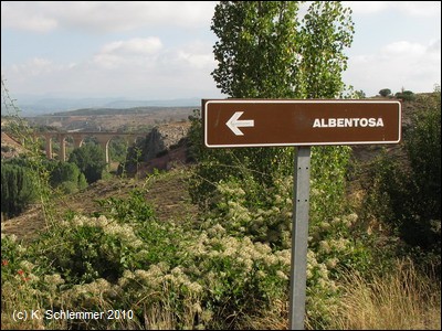 Wir nähern uns dem Ort Albentosa mit seinem großen Viadukt. Eine durch Vandalismus beschädigte Tafel erklärt das Bauwerk, leider ist kaum noch etwas lesbar.
