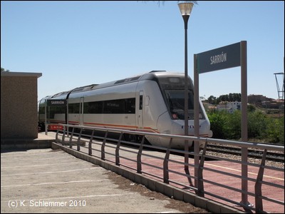 In Sarrión halten die modernen Triebzüge der RENFE. Der aktive Bahnhof der Parallelstrecke liegt auf der anderen Seite des Radwegs etwas außerhalb des Ortes.