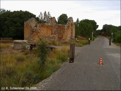 Die Ruine eines alten Hauses trotzt dem Zahn der Zeit. Die neuen Unterführungen sind immer gut für eine Überraschung! Am alten Bahnhof von Caudé ist ein Rastplatz entstanden, nicht wirklich gemütlich und keinerlei Schatten.