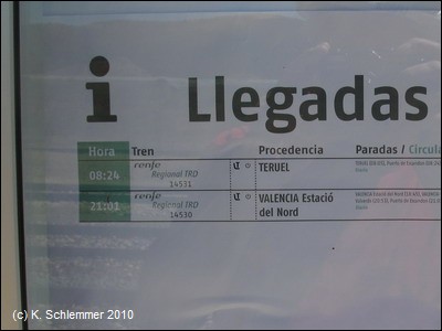 Der Bahnhof von Teruél, an dem die wenigen Züge der Strecke Valencia-Zaragoza ankommen, ist von einer Wohnzimmeratmosphäre mit Standuhr (Made in Germany!) geprägt. Der Fahrplan der „Regionales“ mit 3 Zügen nach Valencia und 3 Zügen nach Zaragoza pro Tag garantiert eine beschauliche Atmosphäre. Die Oberstadt ist vom Bahnhof aus mit einem Aufzug zu erreichen. Das Personal der RENFE war uns sehr behilflich bei der Organisation für unseren Fahrradtransport, der trotz der widrigen Umstände einwandfrei funktionierte (vielleicht hatten wir auch nur Glück).