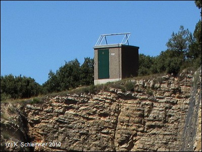 Und wieder tiefe, felsige Einschnitte in die Landschaft. Ein Rastplatz mit einem Brunnen und den originellen Fahrradständern am Wegesrand.