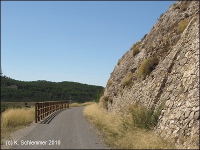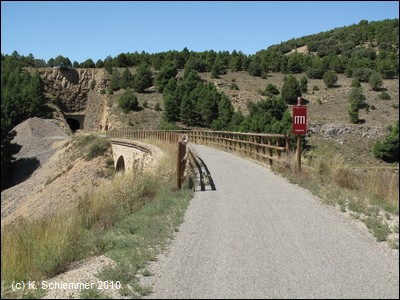 Die Unterteilung der Vía Verde de Ojos Negros in zwei Abschnitte ist rein willkürlich. Solange der letze Teil der Bahnstrecke vom alten Bahnhof Santa Eulalia (Ruine) zu den Minen von Ojos Negros noch nicht vollständig ausgebaut ist, haben wir dem 3. Teil eine eigene Seite gegeben: Via Verde de Ojos Negros - Minas. Der Radweg überschreitet die Strecke die Grenze der autonomen Gemeinschaften Valencia und Aragón. Der Abschnitt zwischen Barracas und Sarrión beinhaltet als Höhepunkt das gewaltige Viadukt von Albentosa sowie den gleichnamigen Tunnel (400 m) und den Tunnel von Sarrión (350 m). Von Albentosa aus geht es allmählich bergauf, die Höhendifferenz bis zum Pass von Escandón beträgt knapp 300 Höhenmeter. In dieser Höhe ist mit raschen Wetteränderung, evtl. auch mit kräftigen Wind zu rechnen.