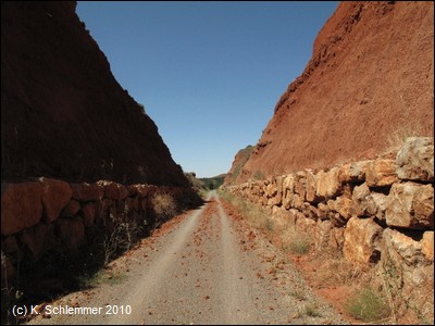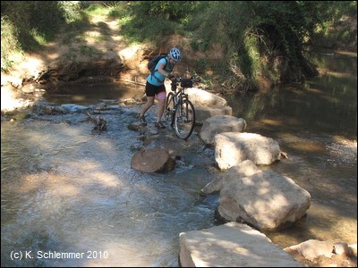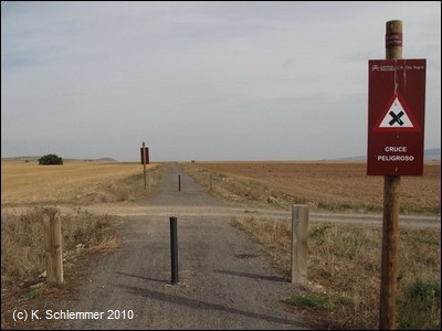 "Gefährliche Kreuzung" steht auf dem Schild! Na ja! Eine Brücke über einen ausgetrockneten Bach: wenn es regnet, sieht es hier schnell anders aus!