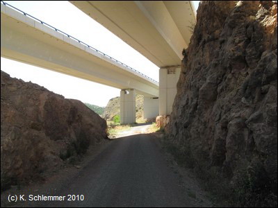 Eine mächtige Mauer schützte die alte Bahntrasse in dieser engen Schlucht. Und wieder kreuzt die Autobahn.