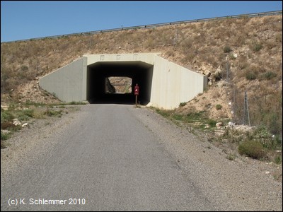 Nach kurzer Fahrt entlang der Autobahn (hier wurde die Trasse zerstört, der Radweg und musste neu gebaut werden) geht es durch eine Unterführung. Hier ist mit schlechter Wegstrecke durch Geröll auf der Fahrbahn und Überflutung zu rechnen! Ein neues Schild wurde bereits wieder herausgerissen!