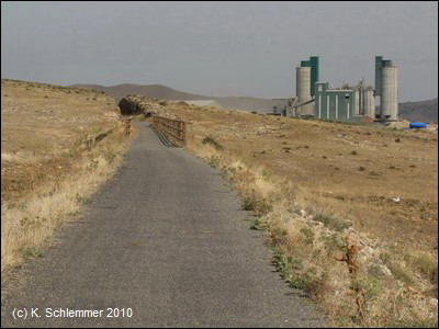 Mitten in der Ebene ein felsiger Einschnitt.Die Türme einer Fabrik tauchen auf.
