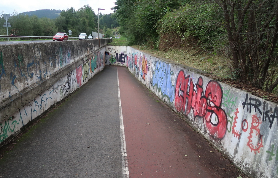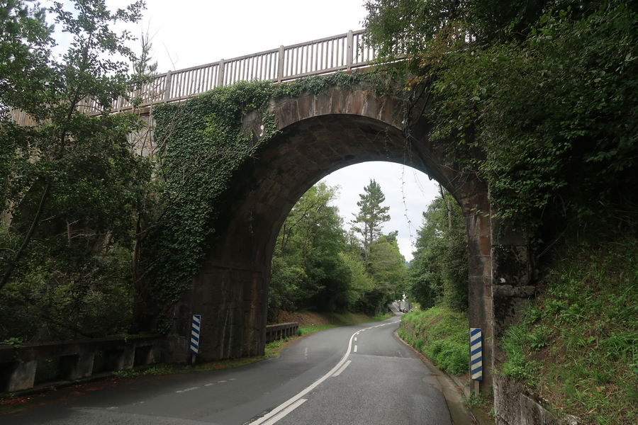 Es geht kräftig in Kurven hinab ins Tal. Der Blick zurück zeigt noch einmal eine Brücke der alten Bahnstrecke. Erst am Ortsanfang von Eskoriatza beginnt ein Radweg.