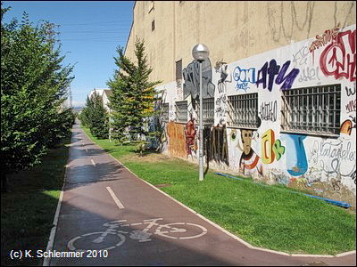 Die Region ist dicht bebaut, dennoch ein breiter Weg für Fußgänger und Radler.