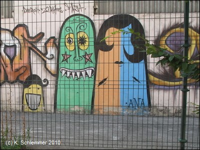 Richtung Gamarra geht es stadtauswärts auf einem roten Asphaltbelag. Freundliche Gestalten an den Fabrikwänden begleiten uns.