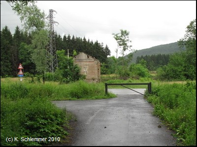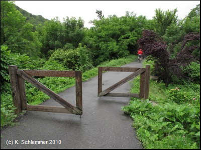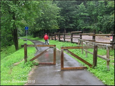 Vor dem Ort dann diese klappbaren Auffahrsperren. Endlich taucht auch wieder eine Beschilderung auf, wir verlassen wieder die Bahntrasse.