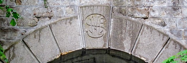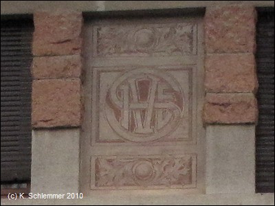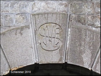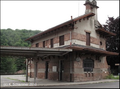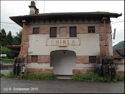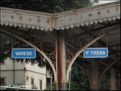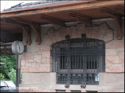 Am Bahnhofsgebäude findet man wieder das Signum der Betreibergesellschaft SVIE. Die schmiedeeisernen Gitter vor den Fenstern zeigen interessante Verzierungen.