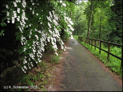 Das Bauwerk verschwindet fast im dschungelartigen Bewuchs. Der Radweg führt weiter bergauf.