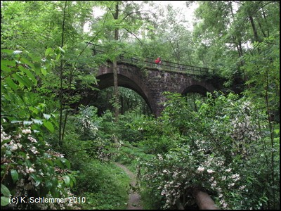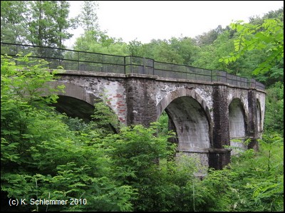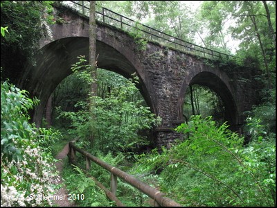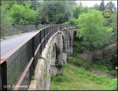 Eine Brücke mit schräg gemauerten Bögen führt über das Tal.