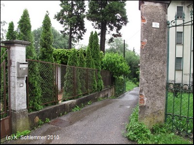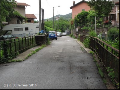 Aus einem engen Gässchen trifft man auf die Straße in Cadegliano. In der Gegenrichtung aufpassen, dass man den Abzweig nicht übersieht!