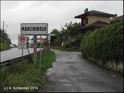 Die Trasse führt den Berg hinauf bis an die Staatsstraße SS233. Wir sind am Ortseingang von Marchirolo, hier endet der Radweg auf der Bahntrasse vorerst. Unschön geht es an der Leitplanke entlang ein Stück durch den Ort.