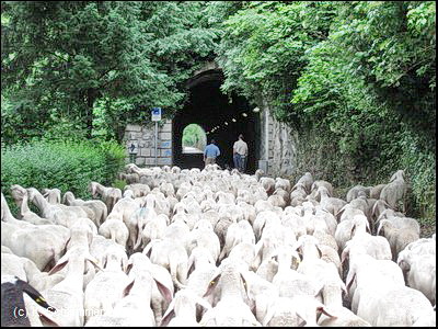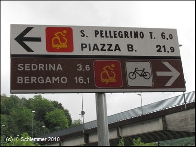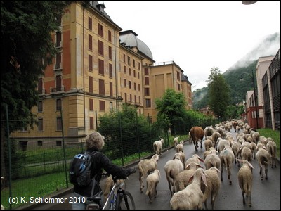 Am Ortsrand geht es durch eine kleine Brücke. Bei San Pellegrino Terme, hinter dem einst mondänen Grand-Hotel, ist der Radweg blockiert: Viehtrieb!