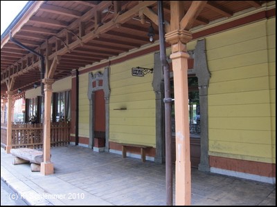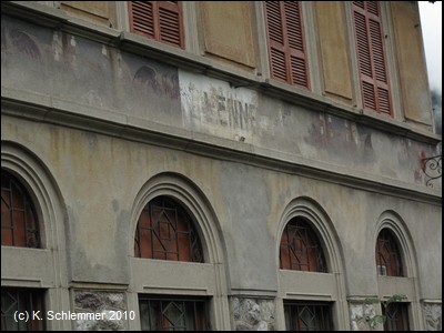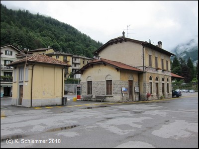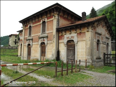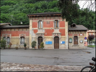 Der Bahnhof San Pellegrino Terme von der Flussseite aus gesehen, wohl früher ein wahres Schmuckstück! Auch die Bahnsteigseite ist noch sehenswert.