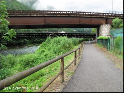 Auf der Brücke liegen noch die Gleise. Dann sind wir nach rund 2,5 km wieder auf der Trasse.