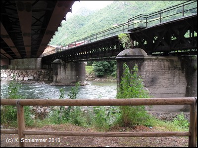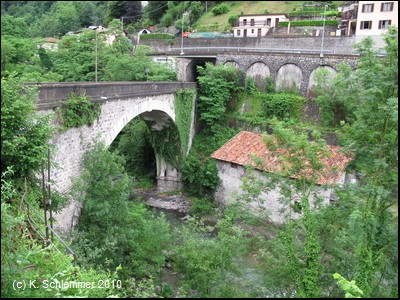 Blick von der Brücke auf den Fiume Brembo und das Kraftwerk. Und der Blick auf das Viadukt vom Kraftwerk aus