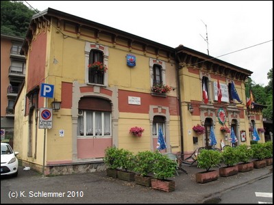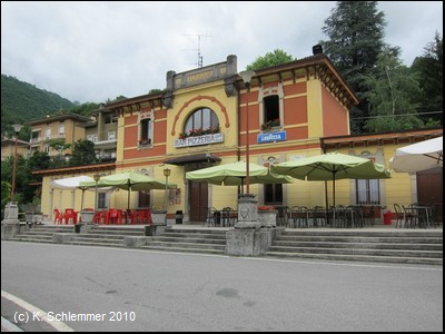 Es geht am alten Bahnhof von San Pellegrino vorbei, er beherbergt ein Restaurant. Der Stationsname ist noch lesbar. (San Pellegrino hatte zwei Bahnhöfe!).