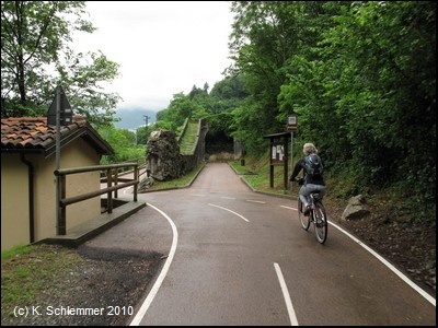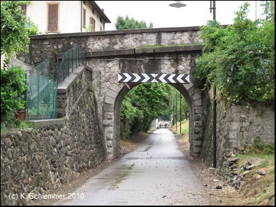 Wieder auf der Trasse. Vorsicht, auch hier gibt es Pfostensperren (Tarnfarbe)! Der Weg führt über ein mächtiges Viadukt. In der Ferne erkennt man schon die Kirche von Piazza Brembana auf der Anhöhe.