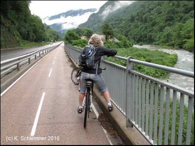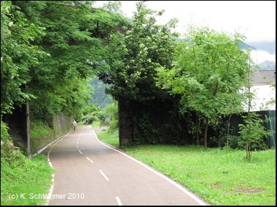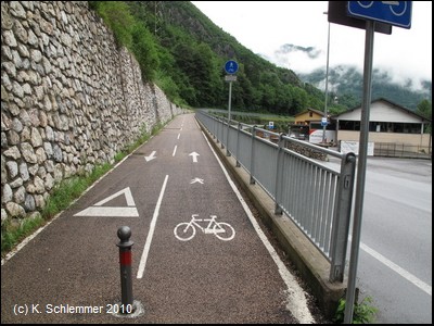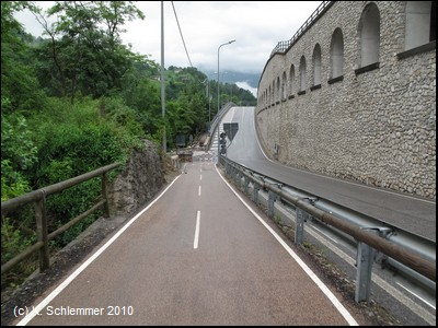Oberhalb der Straße und des Flusses verläuft der Radweg wie auf einer Gallerie.