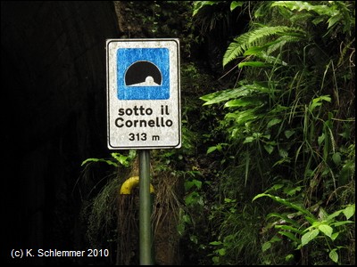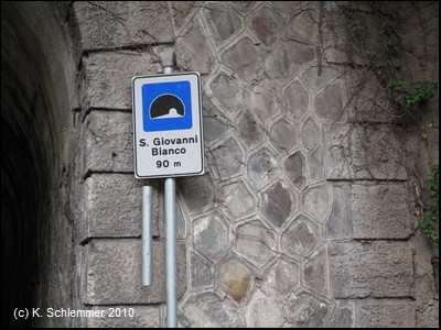 Ein alter Kilometerstein (km 34) ist erhalten geblieben. Schon folgt der nächste Tunnel, nur sehr kurz: Pontesecco, ganze 14 m lang.