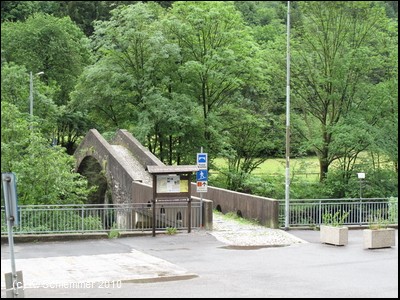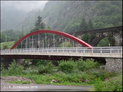 Von der anderen Straßenseite begleitet eine moderne Bogenbrücke das alte Bauwerk. Der Bahnhof von Lenna taucht auf.