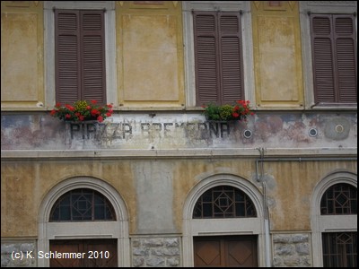 Der Bahnhof von San Giovanni Bianco, gerade noch lesbar die abgekürzte Inschrift.