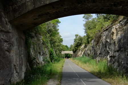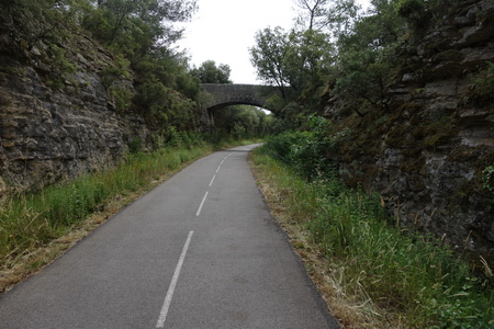 Frisch gestärkt geht es auf dem asphaltierten Radweg in südlicher Richtung schnell voran. Die Strecke macht einen großen Bogen nach Norden und biegt dann Richtung Osten ab. Zwei Steinbrücken überspannen den felsigen Einschnitt.