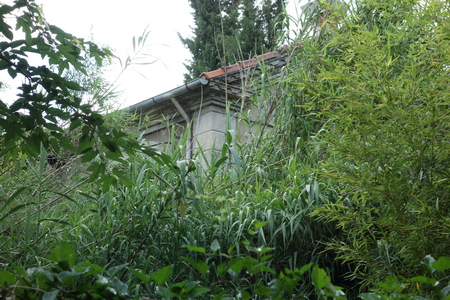....der Bahnhof Junas-Aujargues muss umfahren werden (Privatgelände). Hinter der üppigen Vegetation erspäht man das Dach des Bahnhofsgebäudes.